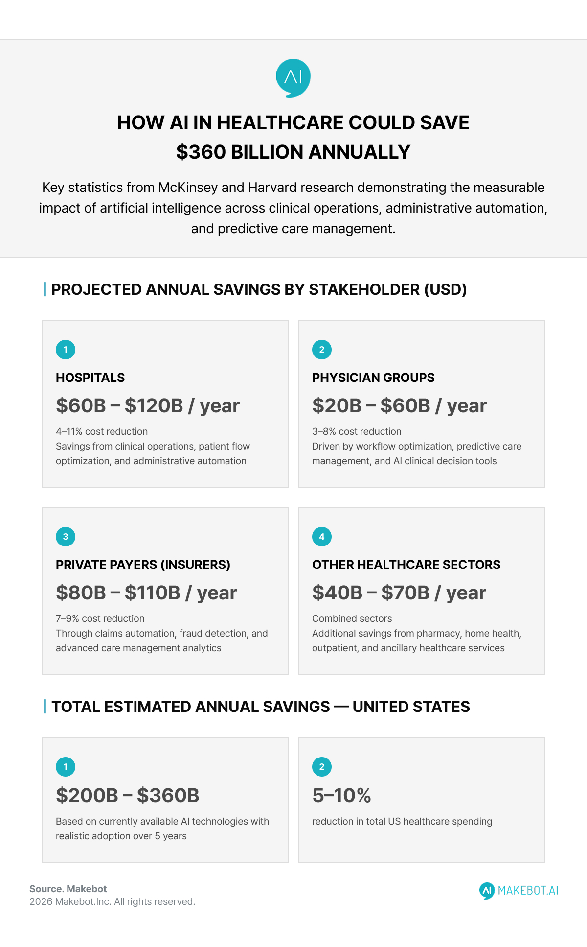 - Hospitals: Potential annual savings of $60 billion to $120 billion, representing 4–11% reductions in hospital costs, primarily through improvements in clinical operations, patient flow optimization, and administrative automation.