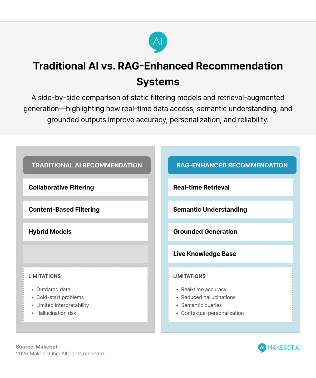 Traditional collaborative filtering and static rule-based engines still power many recommendation systems. But they struggle with real-time inventory changes, complex product queries, and contextual nuance.