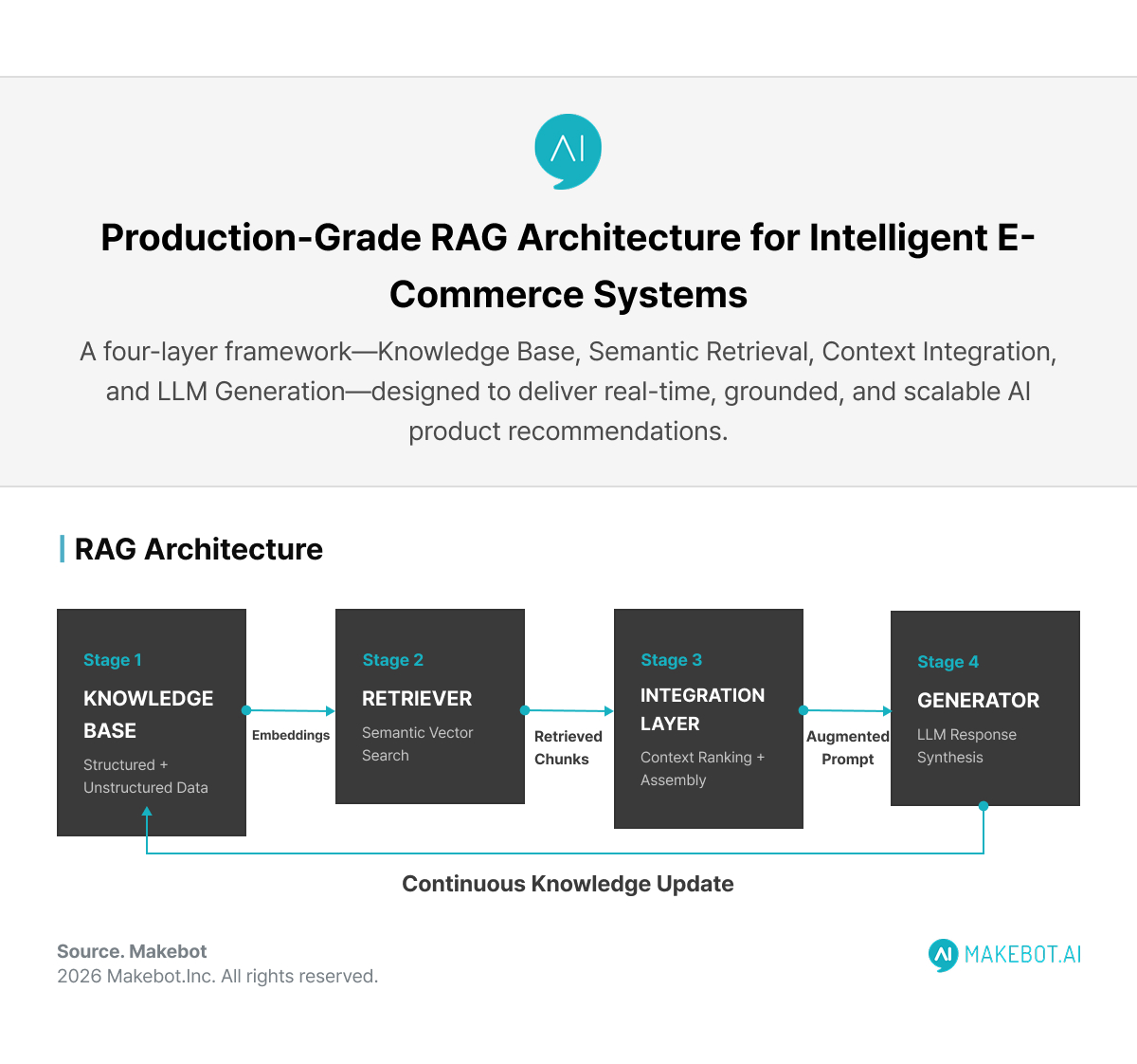 A production-grade RAG in E-commerce architecture typically includes four core components: