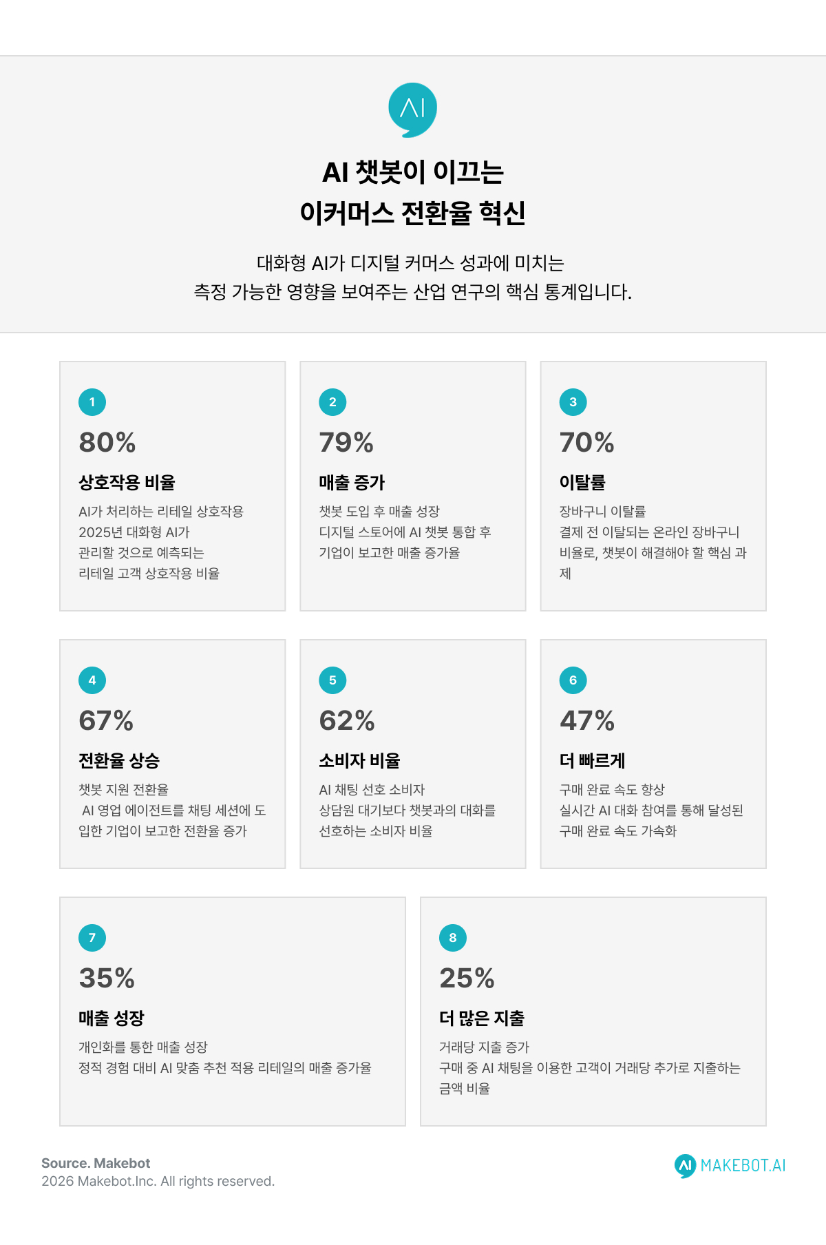 대화형 AI의 빠른 확산은 기업이 디지털 고객 참여 전략을 바라보는 방식 자체가 변화하고 있음을 보여줍니다. 속도, 개인화, 실시간 지원에 대한 소비자 기대가 높아지는 가운데 AI 챗봇은 현대 이커머스 인프라의 핵심 요소로 자리 잡고 있습니다.