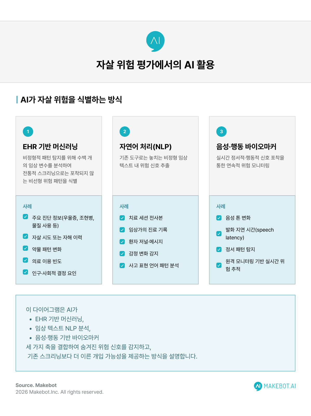 즉, 임상 접점은 존재했지만 위험 신호가 포착되지 못했던 이 간극에서 AI 기반 자살 위험도 평가가 가장 큰 가능성을 보여주고 있습니다.