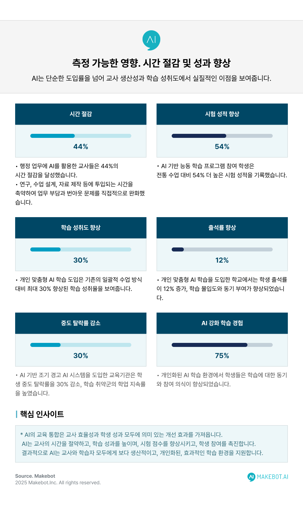 → AI 맞춤 학습 시스템을 도입한 학교는 출석률이 12% 상승, AI 조기 경고 시스템을 활용한 기관은 중도탈락률 이 30% 감소했습니다.