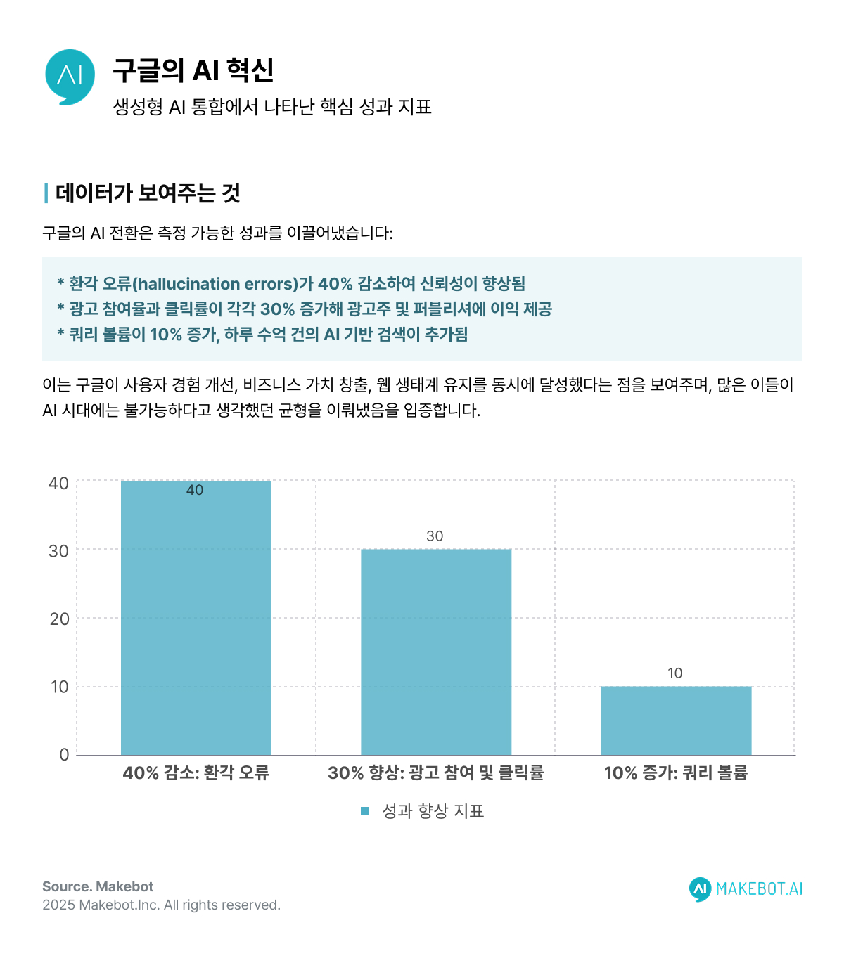 이 기술적 토대는 구글이 검색 지배력을 유지하는 동시에, 새로운 정보 접근 방식과 사용자 참여 카테고리를 열어가는 기반이 됩니다.