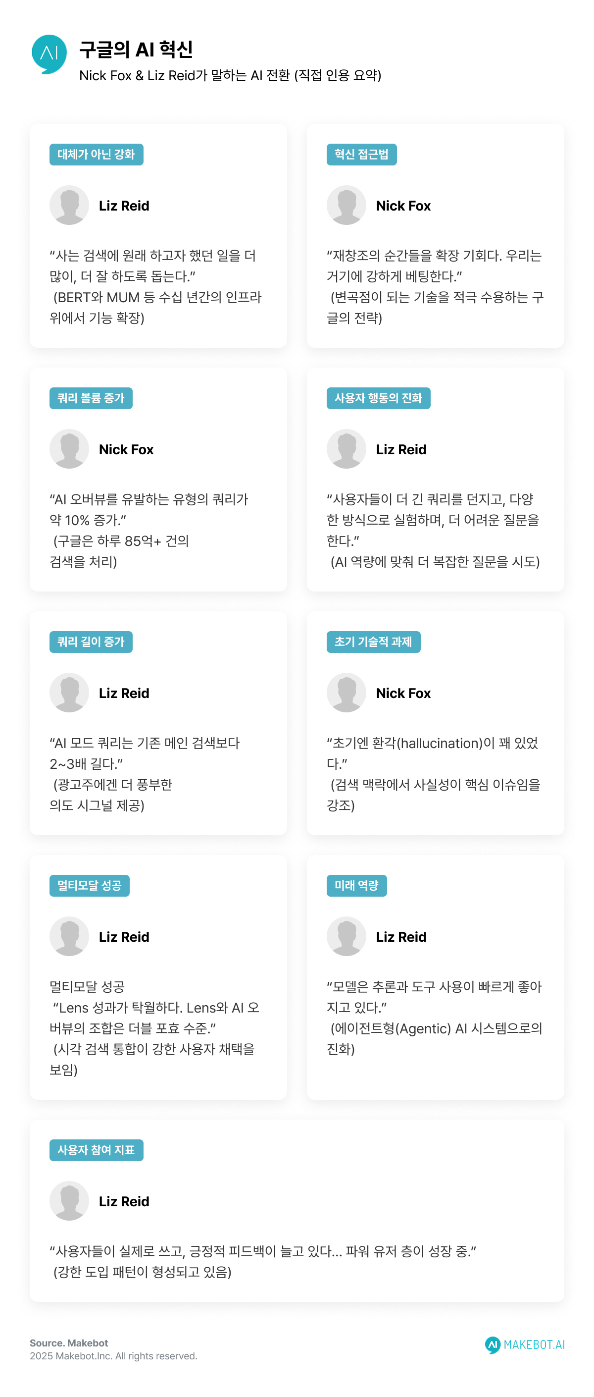 Nick Fox는 구글이 이미 오래전부터 BERT와 MUM 같은 대규모 언어 모델 (LLM) 기반 기술을 순위 개선(ranking improvements)에 활용해 왔다고 강조합니다. 따라서 현재의 생성형 AI 도입은 혁명적 대체가 아니라 점진적 진화라는 것이죠.
