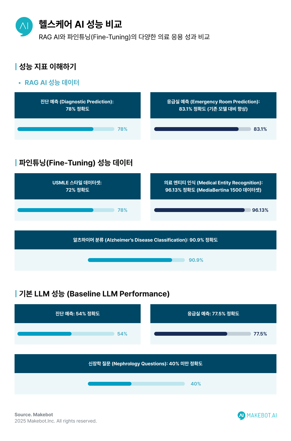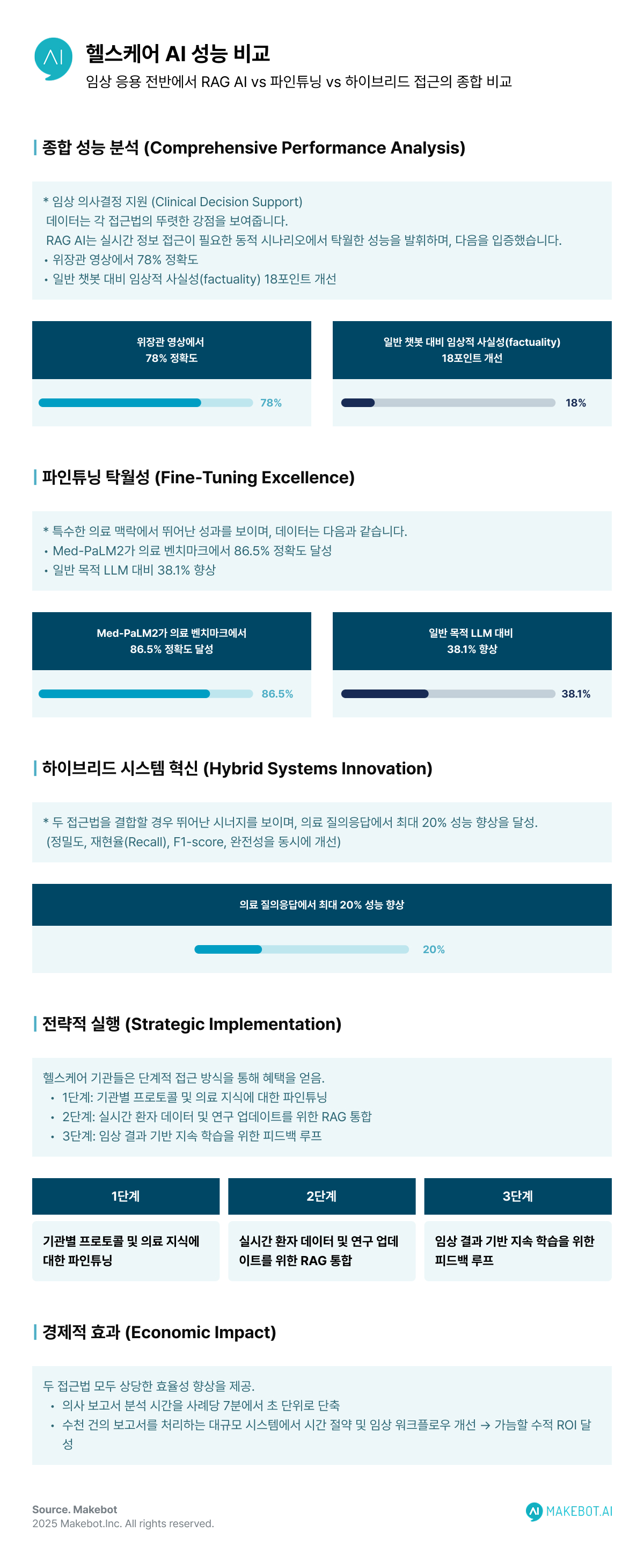 궁극적으로 파인튜닝이나 RAG AI 단독으로는 보편적 해법이 되기 어렵습니다. 검색 증강 생성은 실시간 적응력을 제공하고, 파인튜닝은 정의된 임상 과제에서 깊은 전문성을 보장합니다.