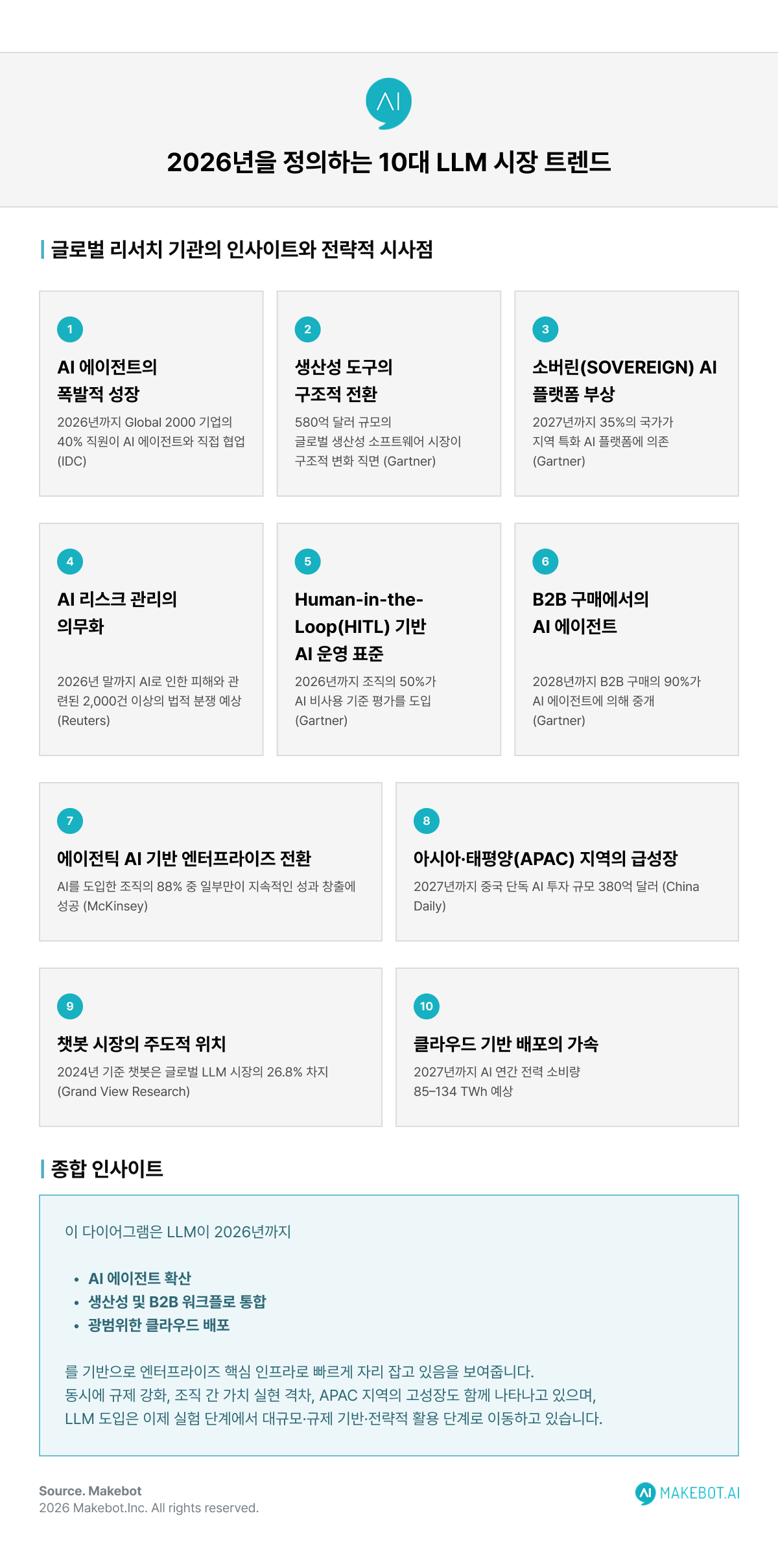 본 아티클은 메이크봇이 Gartner, IDC, McKinsey, 세계경제포럼(WEF) 등 주요 글로벌 리서치 기관과 시장 분석 자료를 종합적으로 분석해 도출한 인사이트를 기반으로 작성되었습니다. 메이크봇은 2025년 한 해 동안 생성형 AI와 LLM 분야의 글로벌 동향을 지속적으로 연구하며, 기술 발전과 실제 조직 환경 사이의 간극을 구조적으로 해석해 왔습니다. 이 아티클은 그러한 축적된 분석을 바탕으로, LLM이 실험적 도구를 넘어 실제 운영 인프라로 전환되는 흐름을 2026년 관점에서 정리합니다.