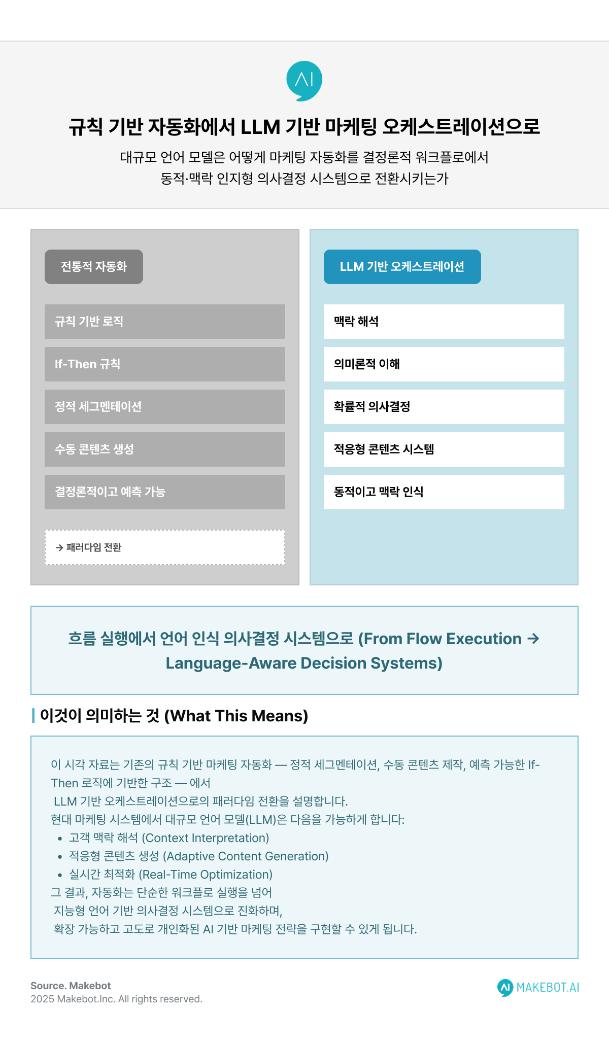 기존의 마케팅 자동화 환경은 정적 워크플로우에 기반하고, 수동 세분화를 통해 고객을 구분하며, 선형적인 콘텐츠 생산 파이프라인 중심으로 운영되어 왔습니다. 그러나 LLM이 내장된 이후의 환경은 동적이고 컨텍스트를 인식하는 오케스트레이션 시스템으로 전환되고 있으며, 확률 기반 개인화 엔진을 통해 실시간으로 사용자 의도와 행동을 해석합니다. 또한 단순한 콘텐츠 제작 프로세스를 넘어, 인텔리전스를 중심으로 연결된 콘텐츠 생태계로 진화하고 있습니다.